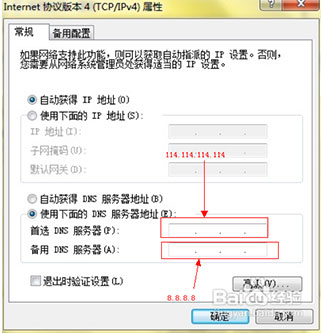 3.选择“使用下面的DNS服务器地址” 在下面的首选DNS服务器地址框内填入以下(114.114.114.114、8.8.8.8),点击确定即可。当然这里的地址可以是您本地宽带商提供的DNS IP。
